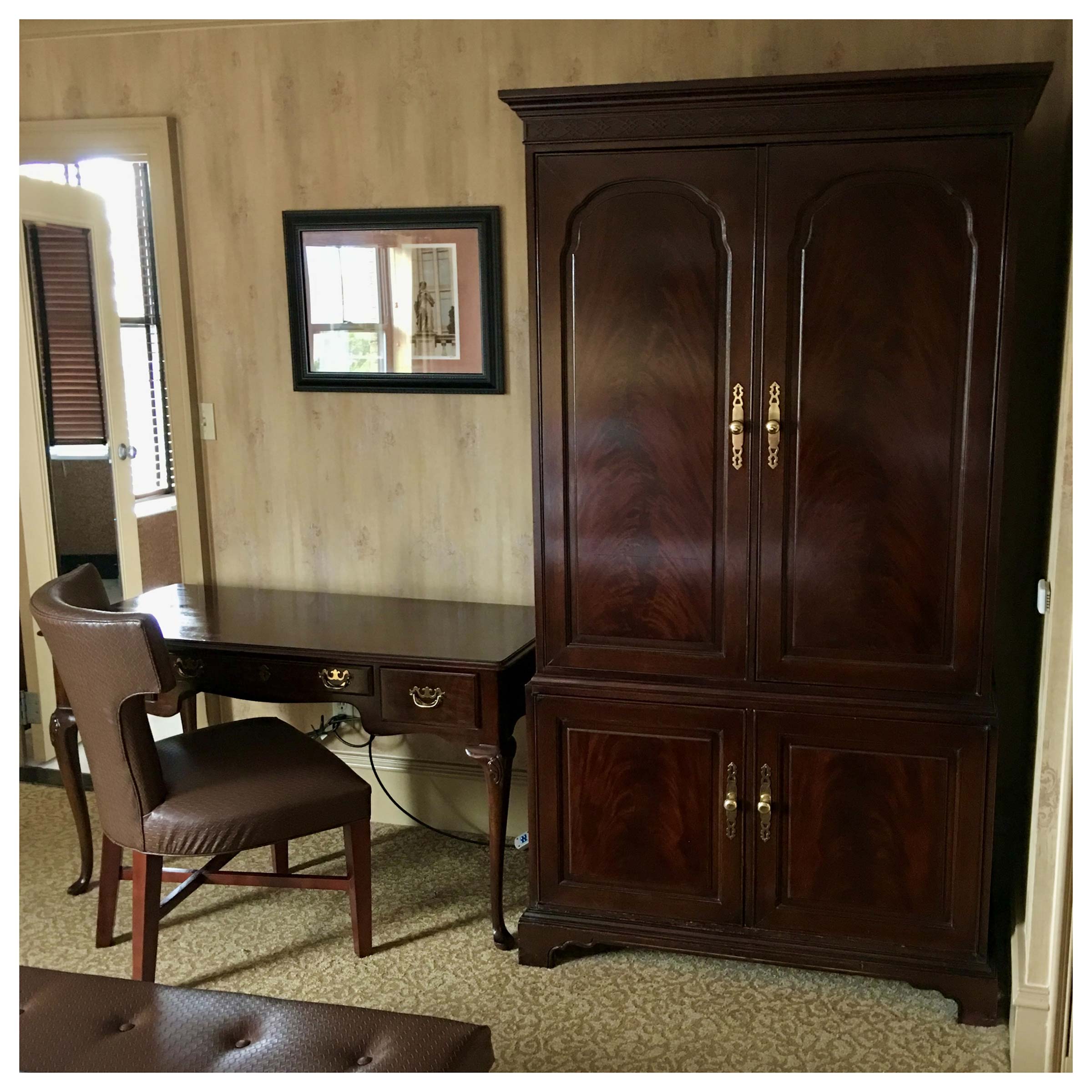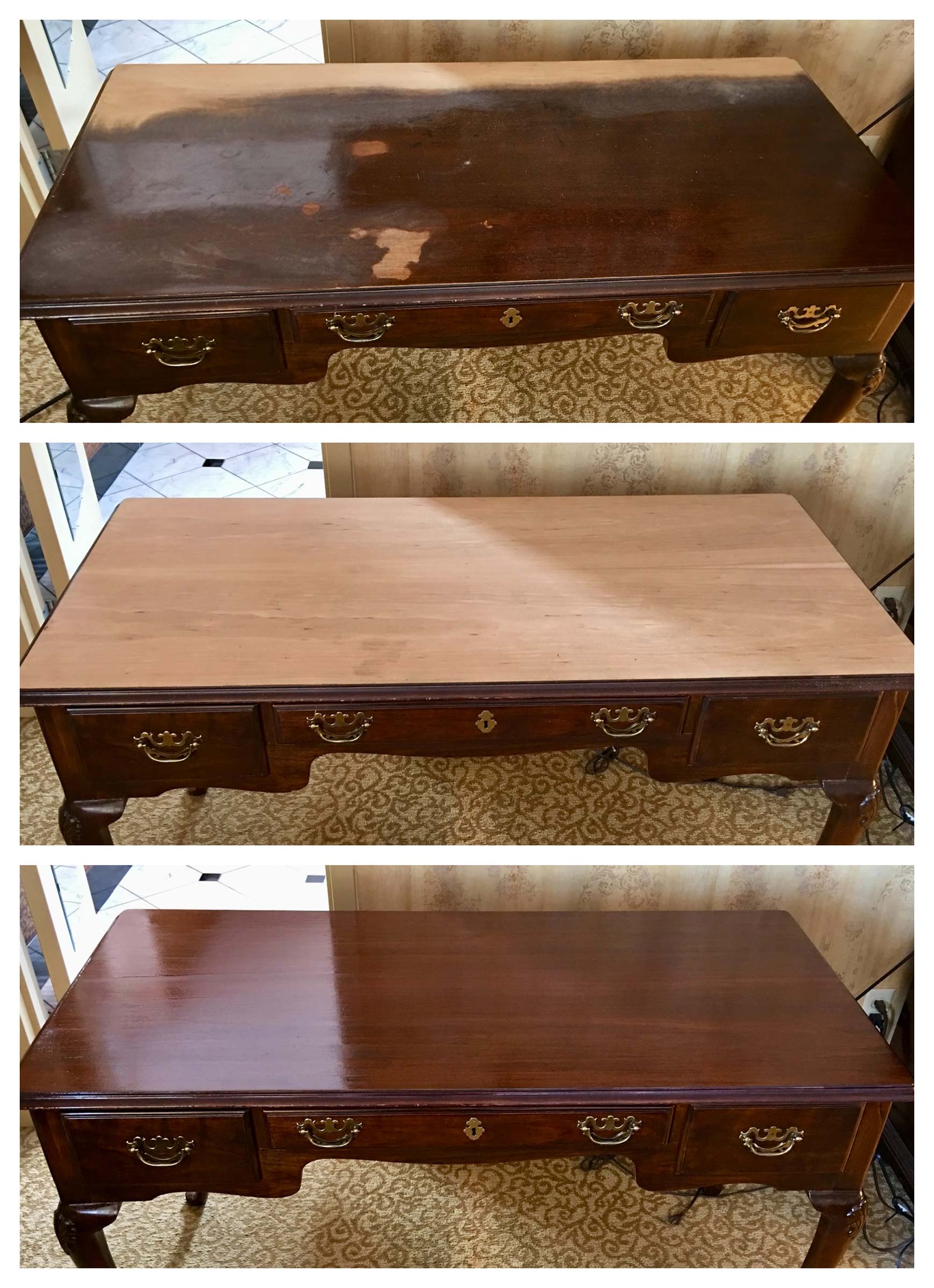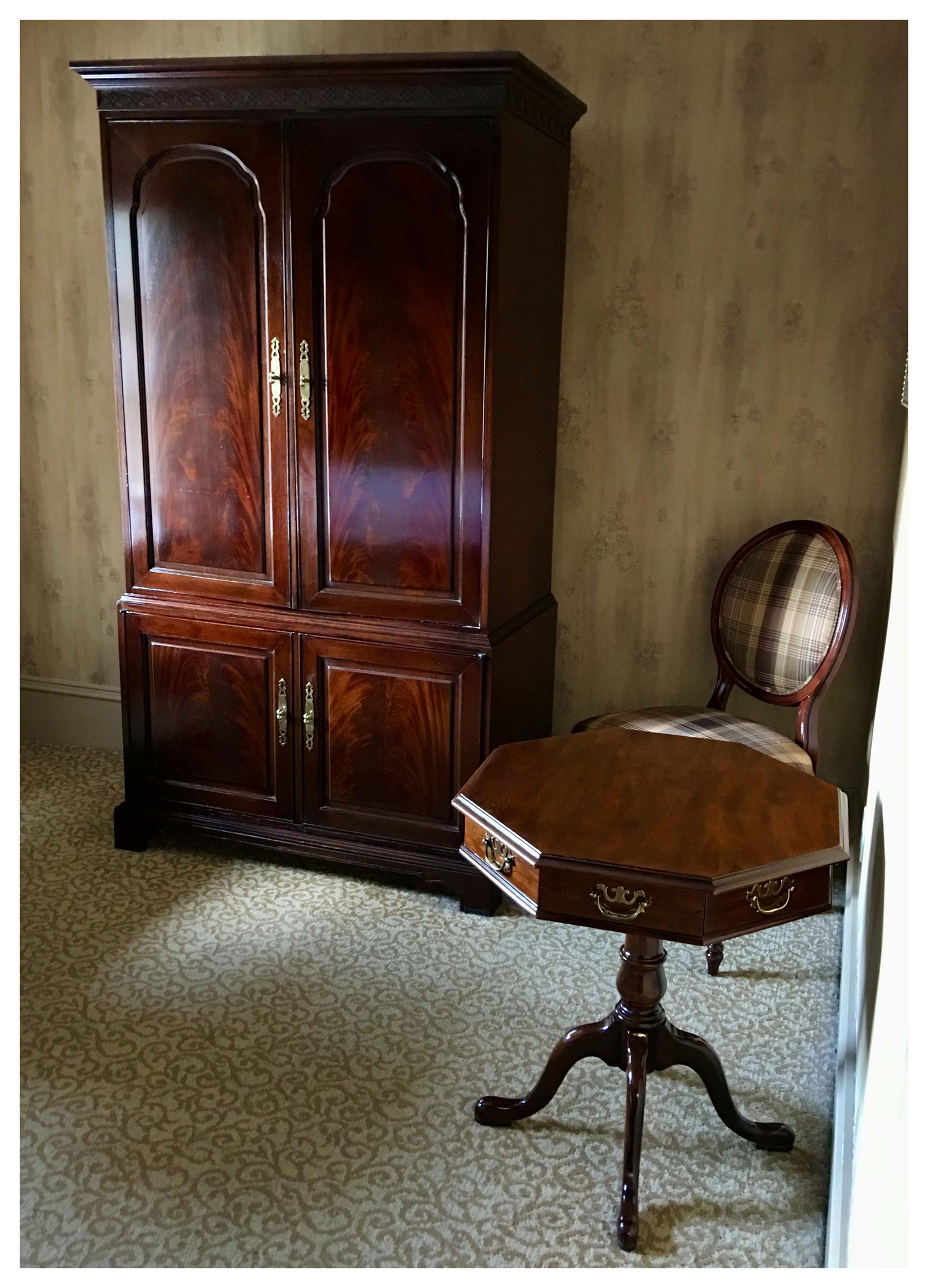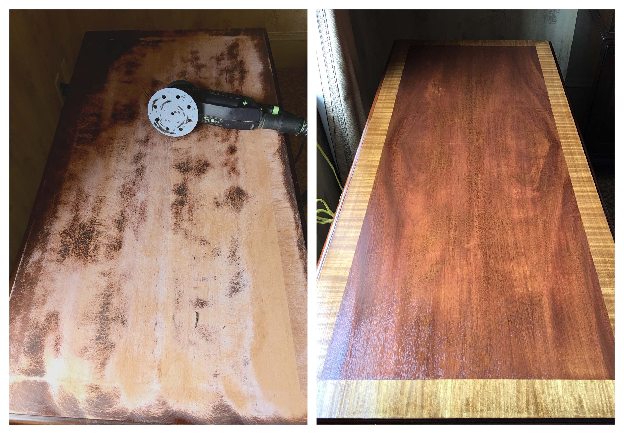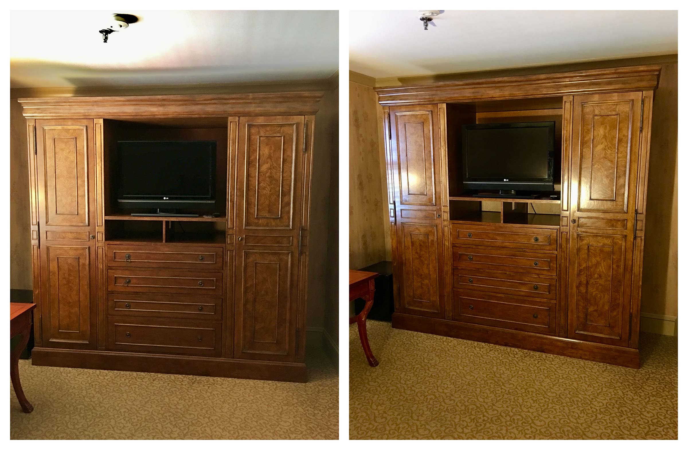 Northern Lights Restoration was hired by the historic Dunhill Hotel to restore the furniture in all 60 guestrooms and the lobby. We refinished full armoires and sets of room furniture. Some guestroom desks required a complete sanding, which was done using our dustless sanding system, followed by expert color matching and finishing.