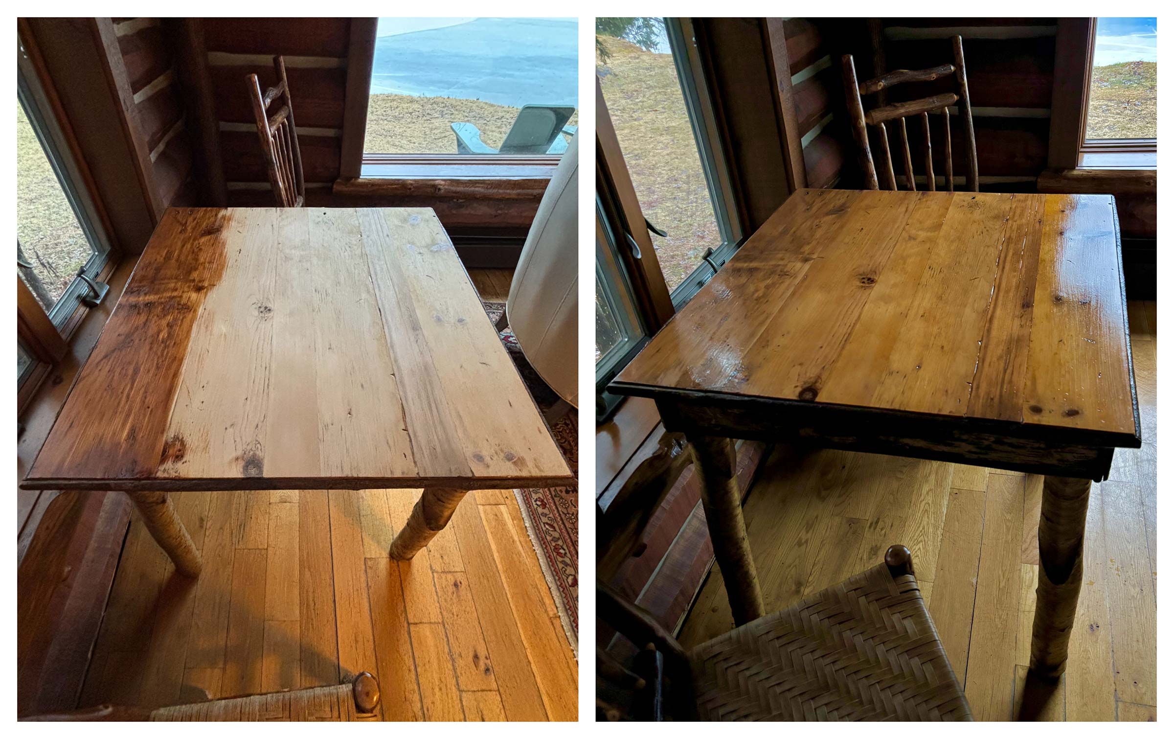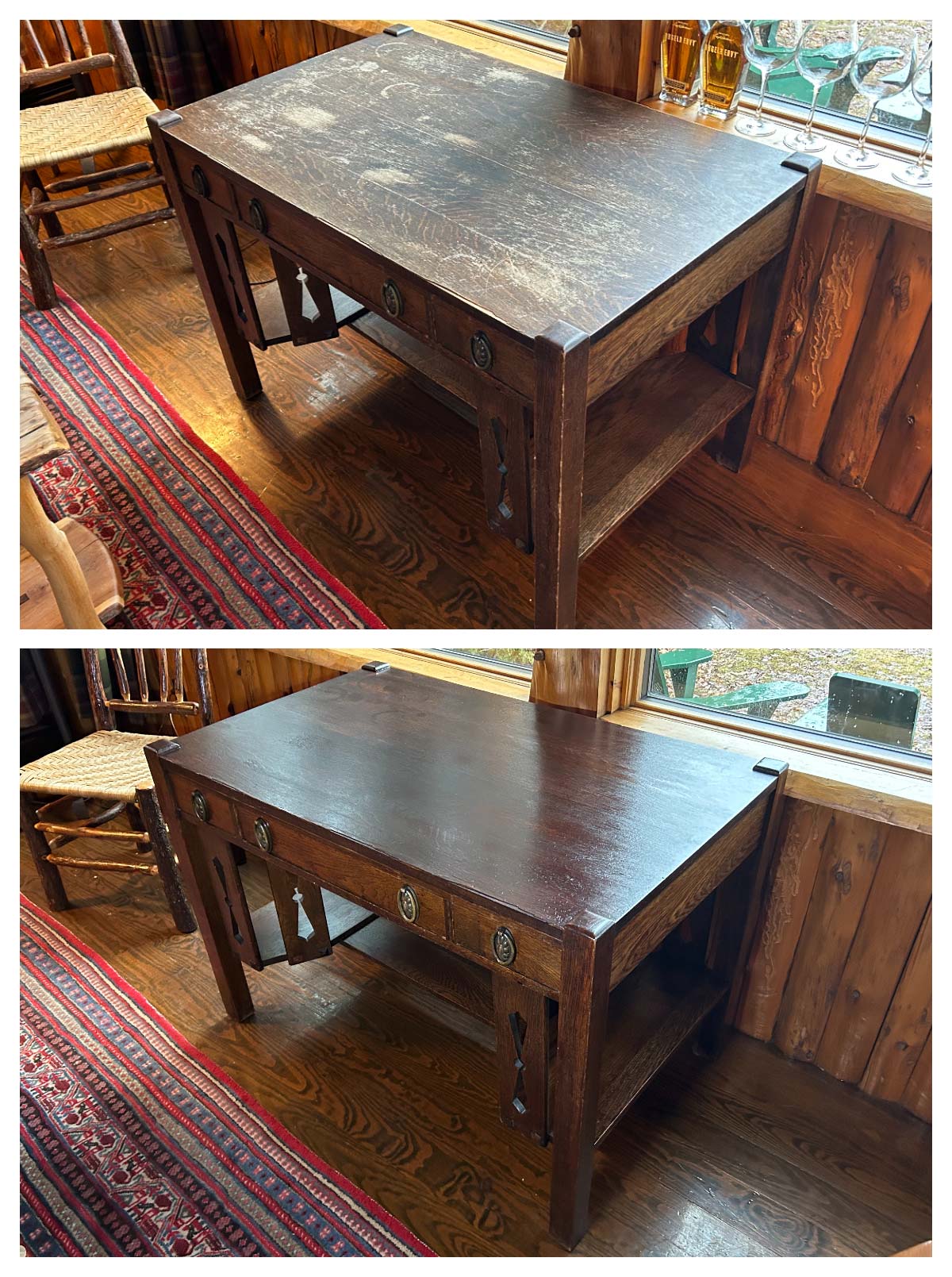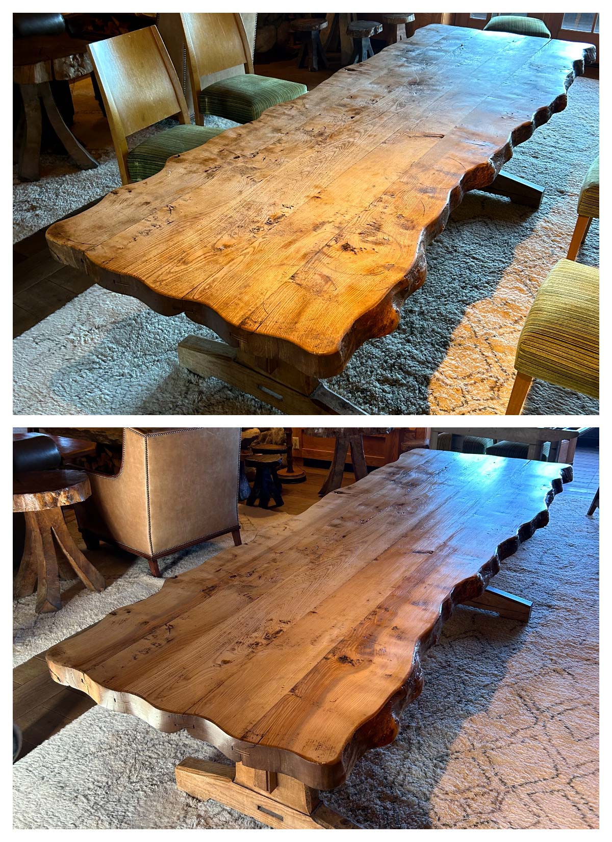 Our team restored numerous pieces at the Lodge, including handcrafted room furniture, treasured English antiques, and unique live-edge minibars. We particularly enjoyed restoring a magnificent fourteen-foot live-edge ash dining table, bringing it back to its former glory. It was a pleasure working on such a unique collection of handcrafted pieces, each with a story to tell.
