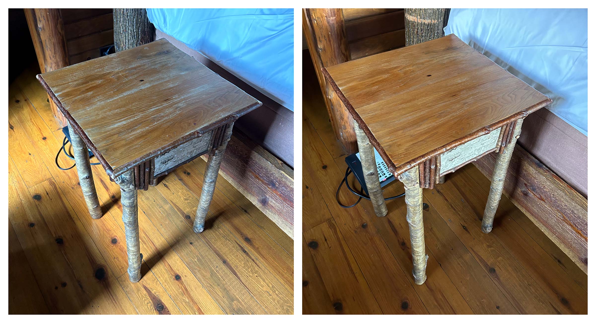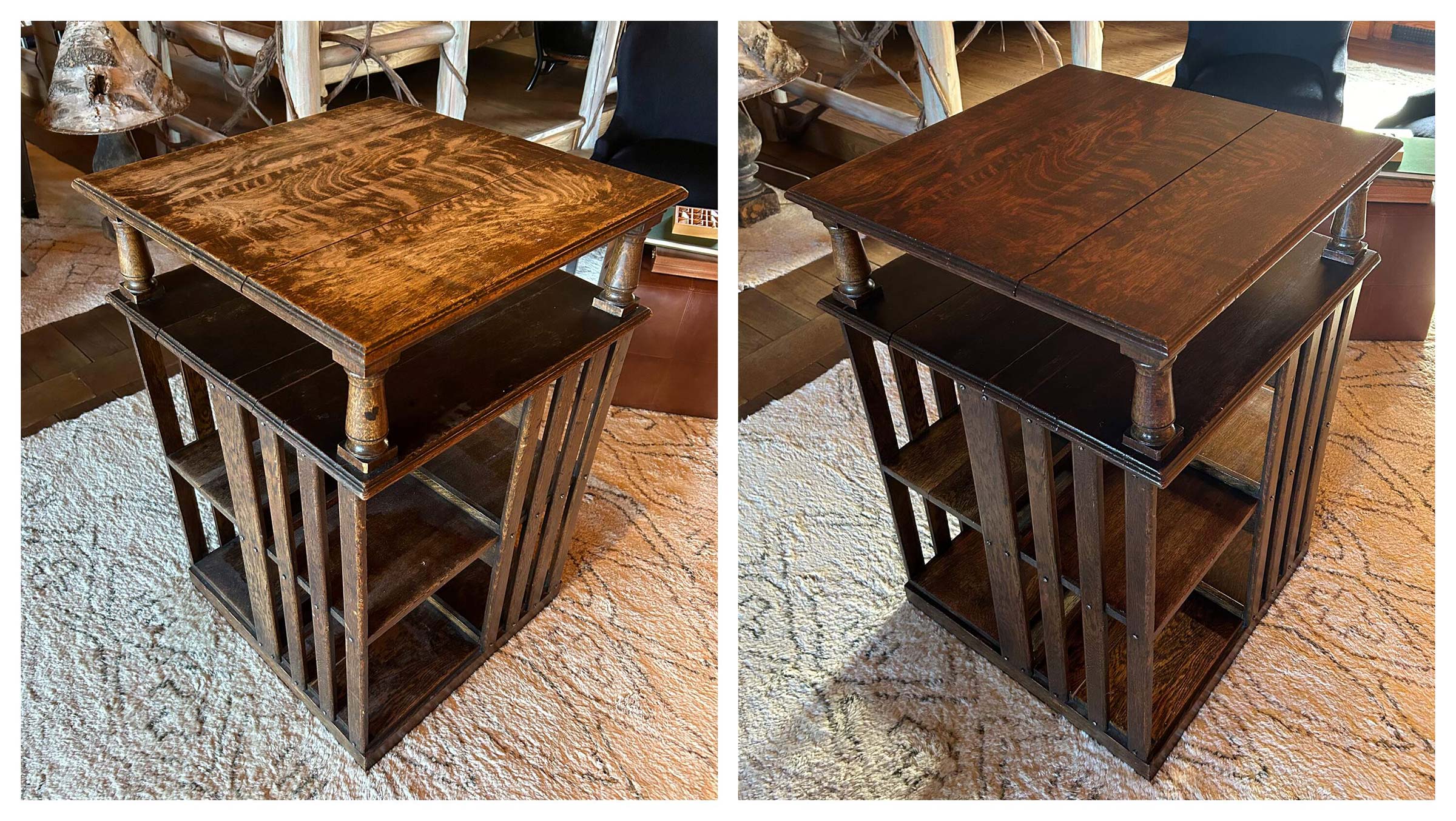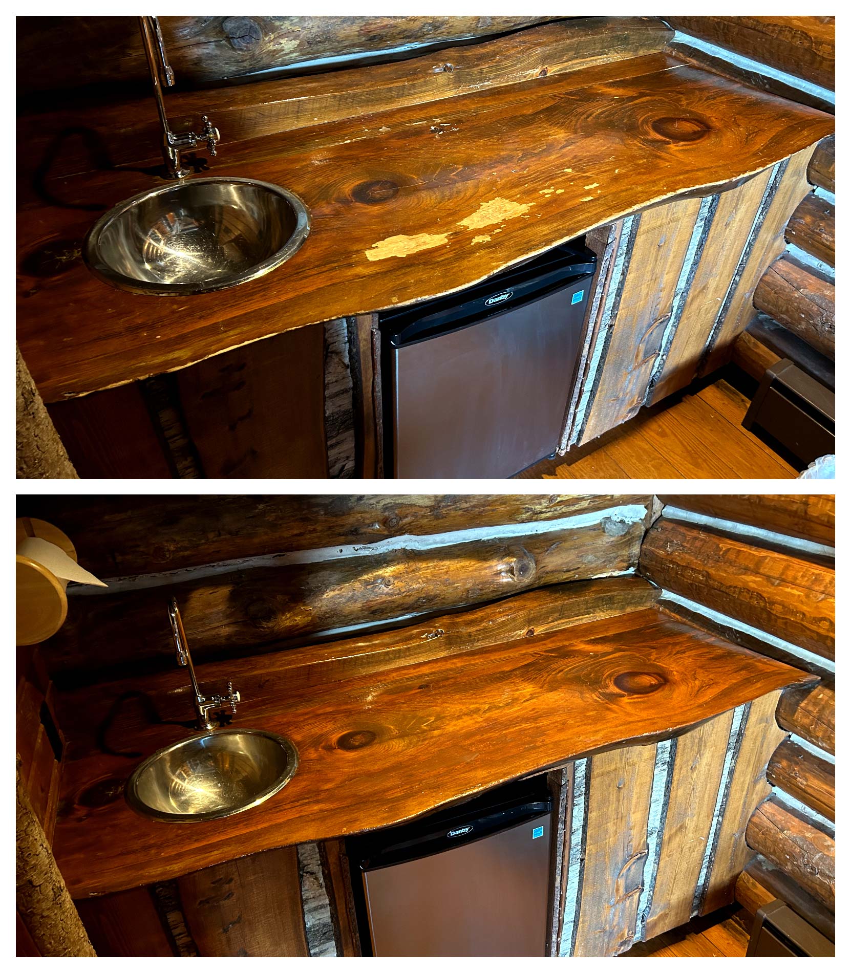 Our team restored numerous pieces at the Lodge, including handcrafted room furniture, treasured English antiques, and unique live-edge minibars. We particularly enjoyed restoring a magnificent fourteen-foot live-edge ash dining table, bringing it back to its former glory. It was a pleasure working on such a unique collection of handcrafted pieces, each with a story to tell.